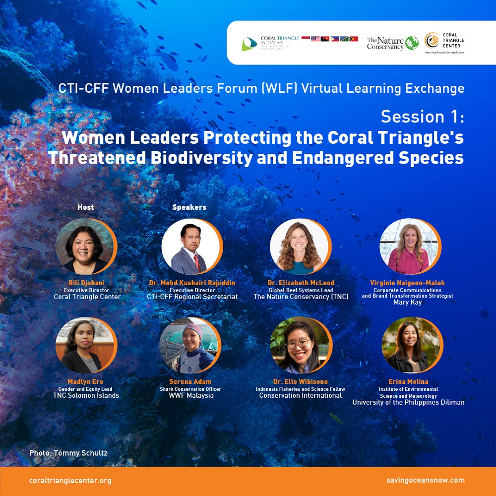 In this context, the CTC in collaboration with the Coral Triangle Initiative on Coral Reefs, Fisheries and Food Security Regional Secretariat and The Nature Conservancy, aimed to shine the spotlight on innovations and actions being undertaken by women leaders across the Coral Triangle in sustaining marine resources through a series of virtual exchanges that highlight successful women-led initiatives in sustainable marine resource management. Session 1 was held on October 3, 2022 and focused on Conservation in the Frontlines: Women Leaders Protecting the Coral Triangle’s Threatened Biodiversity and Endangered Species.