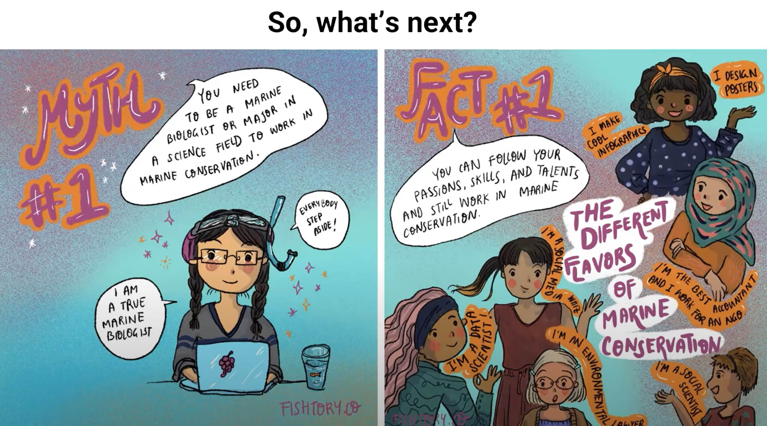 In Indonesia, Dr. Elle Wibisono shared about using art and science to help the public understand fisheries management and its importance to marine conservation and our daily lives. Elle is a Lui-Walton fellow at Conservation International, working as the Senior Manager for fisheries and marine protected areas. She was also a Knauss Marine Policy Fellow at the U.S. Senate, where she helped draft, research, communicate, and negotiate oceans and climate change bills. She also worked at The Nature Conservancy Indonesia Fisheries Conservation Project on the sustainable management of deep-water snapper and grouper fisheries. In addition to her research and policy work, Elle explores the importance of effective science communication by designing and creating fish comics (fishtory.co). Through her comics, she aims to highlight topics in fishery science and conservation in a fun and engaging way, helping the general public to understand their role in sustainable fisheries and its link to marine biodiversity conservation.