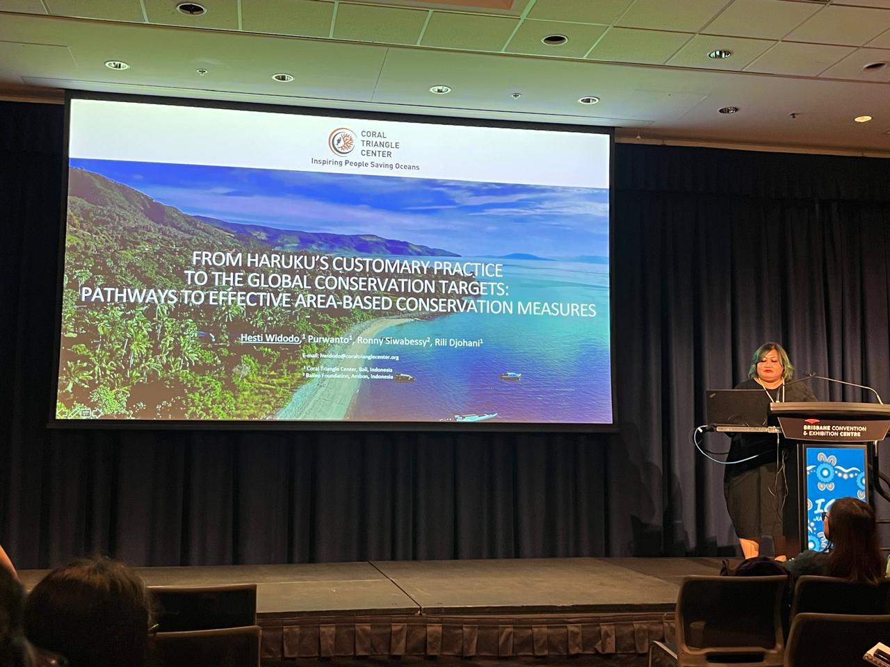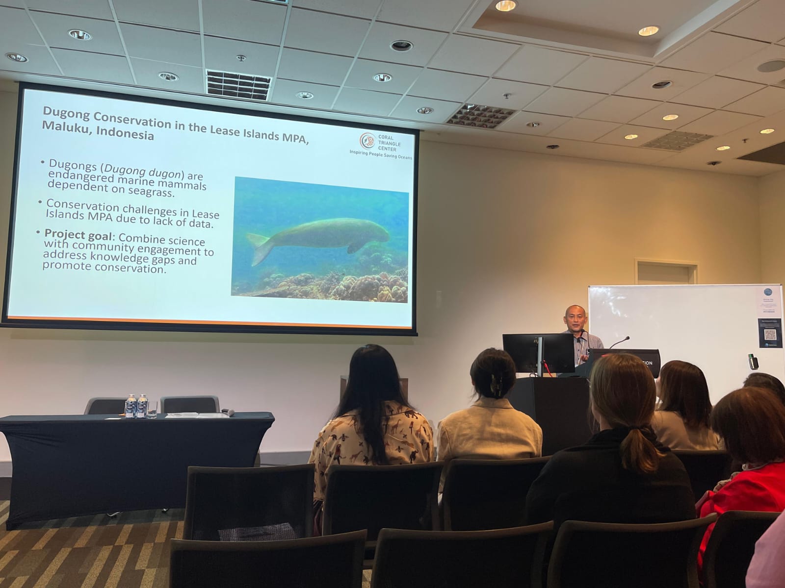 Hesti Widodo, CTC’s Senior Program Manager, opened the first day with a speed talk on how customary marine practices in Haruku, Maluku, are contributing to global conservation goals through locally driven, area-based protection. This was followed by a presentation from Purwanto, CTC’s Maluku Portfolio Manager, who shared a case study on safeguarding dugongs in the Lease Islands using a multi-pronged approach combining community outreach, habitat protection, and policy advocacy.