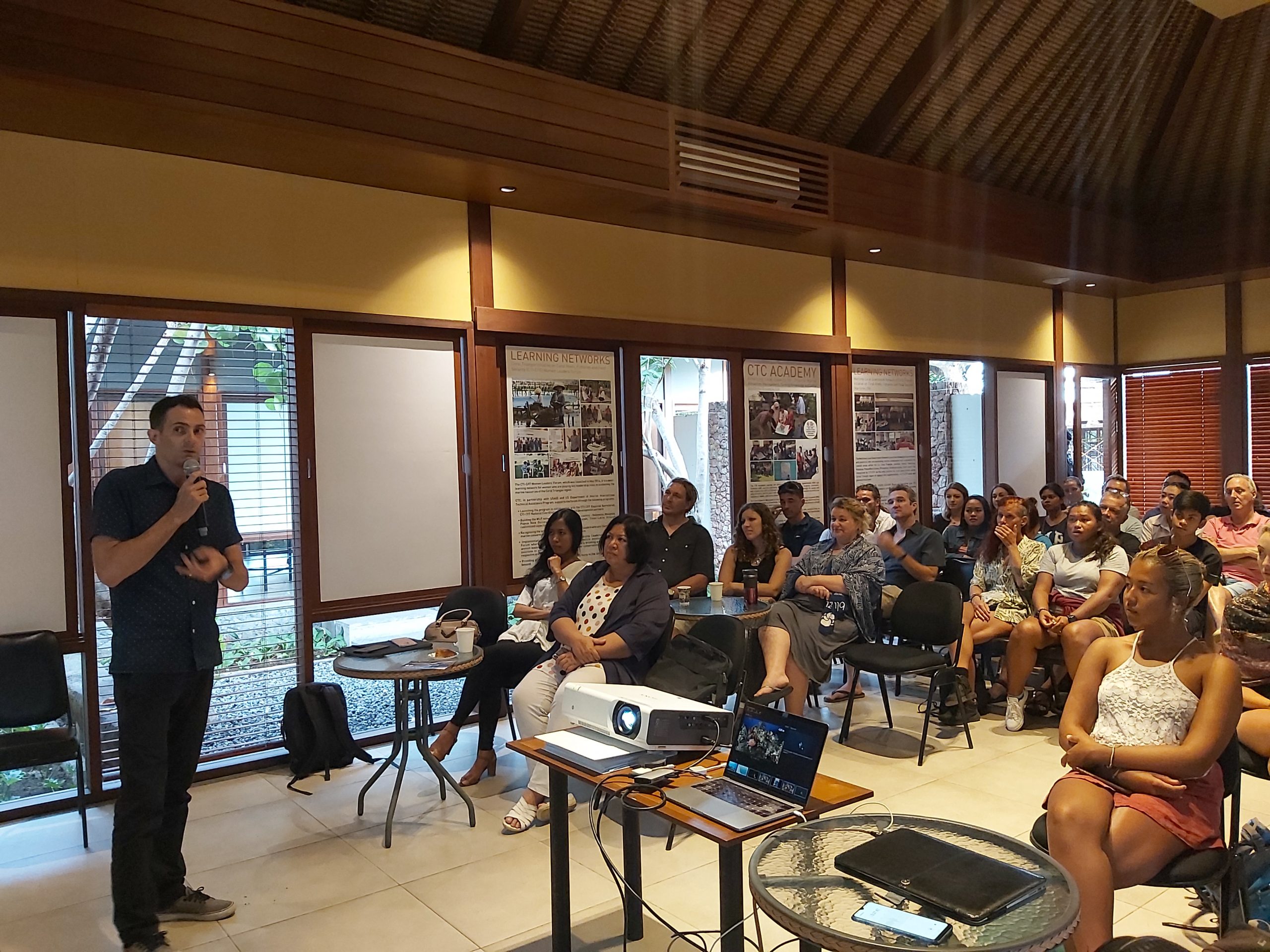 During the lecture, Alexis discussed his pioneering research project on unexplored reef habitats off the northeast coast of Bali particularly in the Karangasem Regency. He described the beauty he found underwater, the threats they face, their importance for shallow-water reefs, as well as for species such as the bump-head sunfish or Mola alexandrini. He also made note of plastic pollution he found during his deep dives underscoring the need to include deep water habitats in marine protection plans.