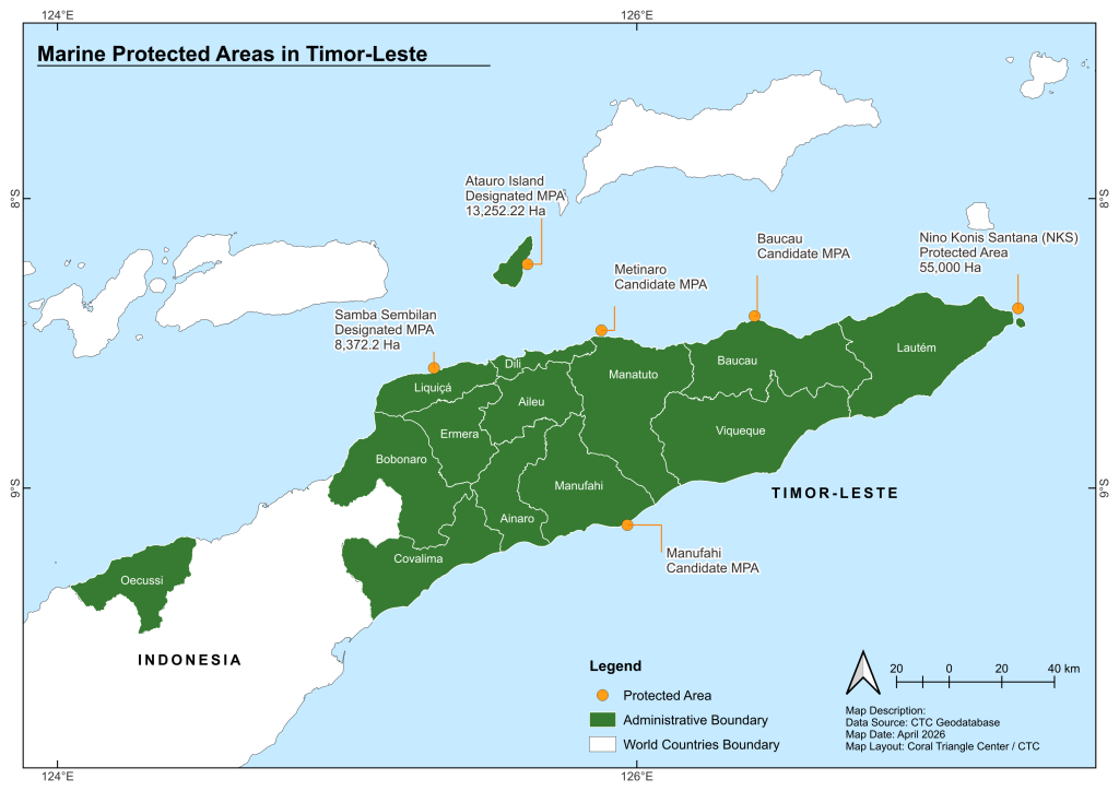 Located between the Dili Strait and the Liran Strait, the Atauro MPA is divided into five zones, including core no-take areas, marine tourism zones, temporary protection zones, sustainable fisheries zones, and aquaculture zones. These zones are designed to protect marine biodiversity while supporting sustainable use by coastal communities.