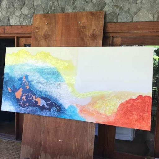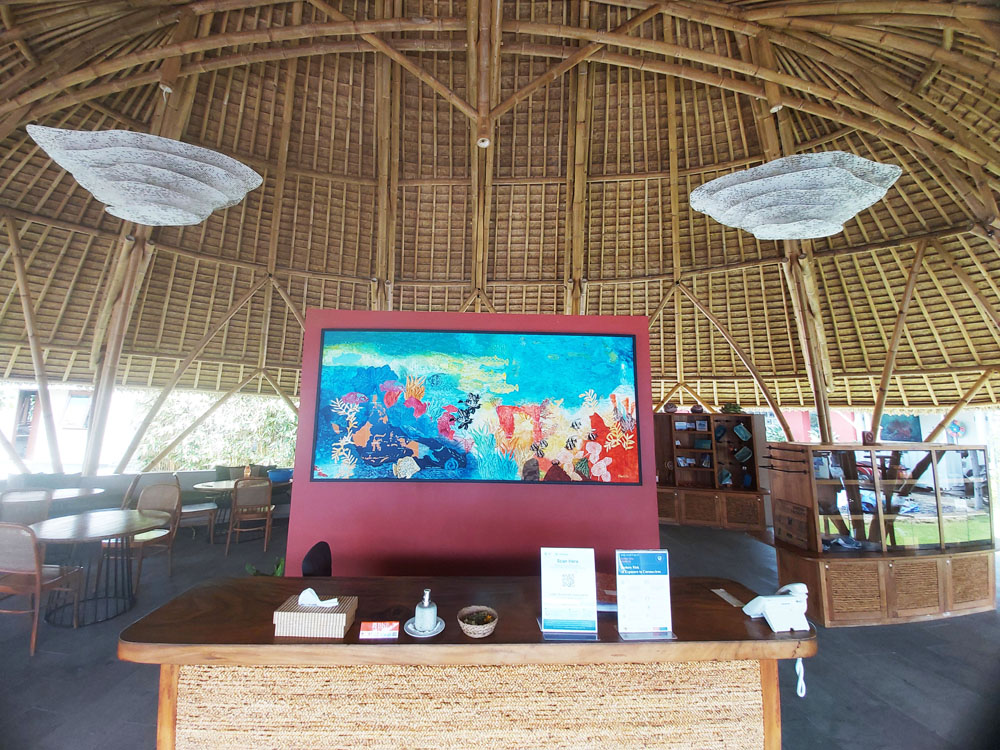 CTC’s Center for Marine Conservation has a new painting by Bali-based artist Davina Stephens. The artwork, which measures 113cm x 243 cm, features the artist’s signature style: utilizing wood blocks that she designed and carved by local artisans as well as colours that are applied in a “wash style.” Davina calls the piece “Coral Triangle” – as it features a map of the region and a marine chart that show the areas where CTC works. The piece hangs at our Center’s reception desk, welcoming every visitor to our learning facility.